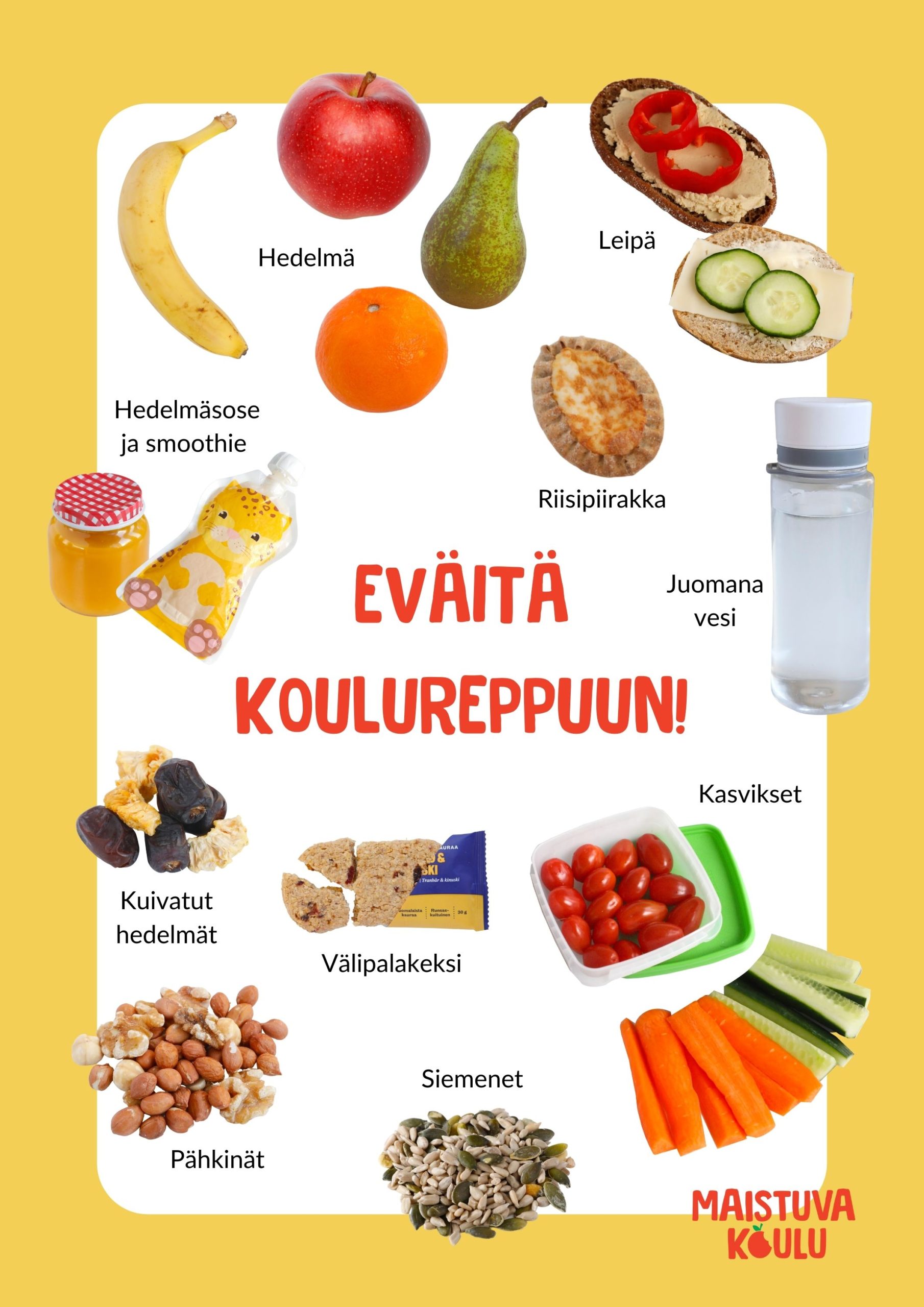 Tästä aamu- ja välipala-aiheisesta ideakortista löydät Maistuvan koulun omia kuvamateriaaleja opetukseen ja viestintään kotien kanssa.