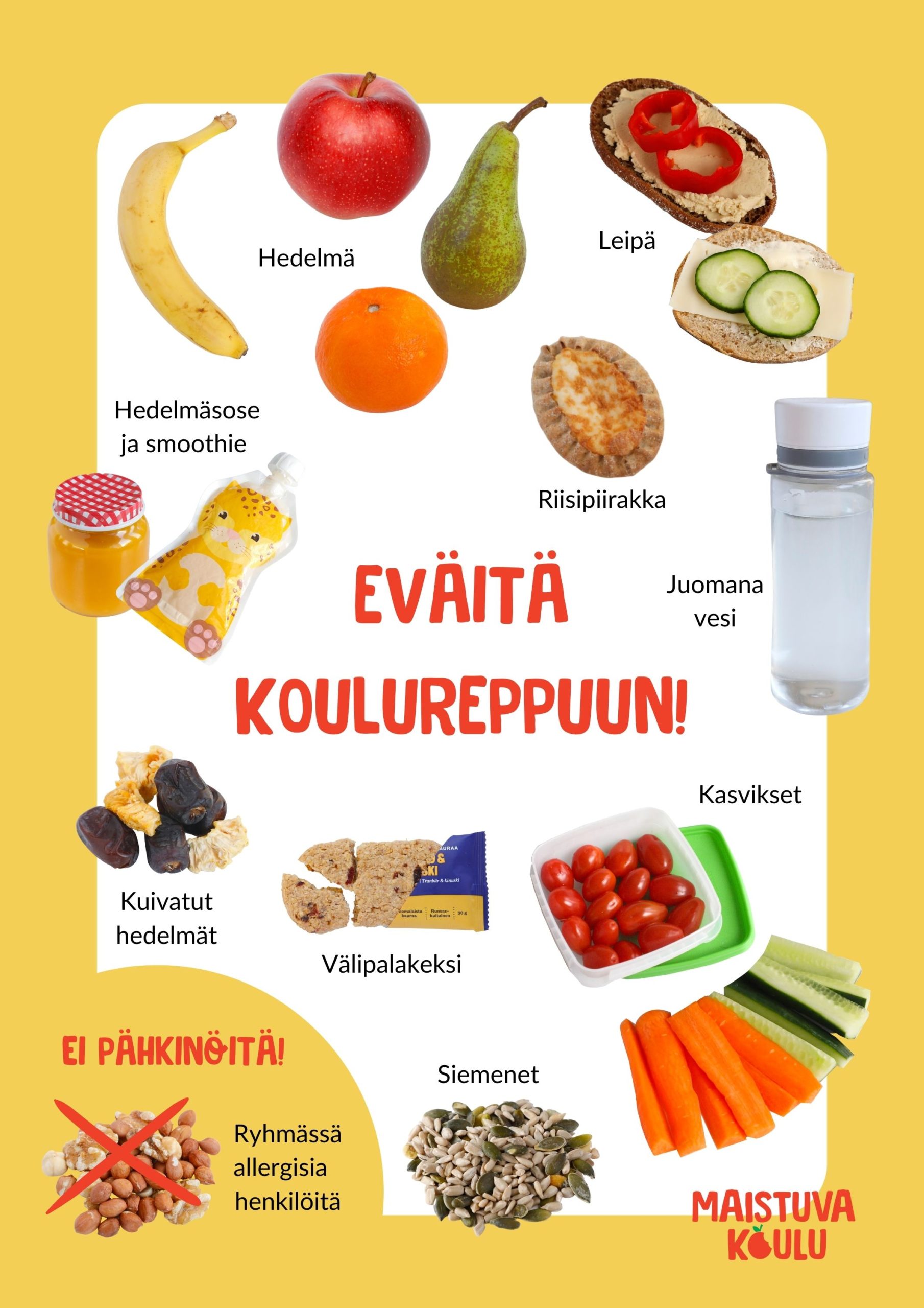Huom! Voit valita esitteen, jossa on pähkinät mukana tai pähkinät on kielletty, riippuen siitä, onko luokallasi pähkinälle allergisia oppilaita.